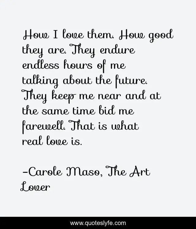 This page presents the quote "How I love them. How good they are. They endure endless hours of me talking about the future. They keep me near and at the same time bid me farewell. That is what real love is.". Author of this quote is Carole Maso, The Art Lover. .