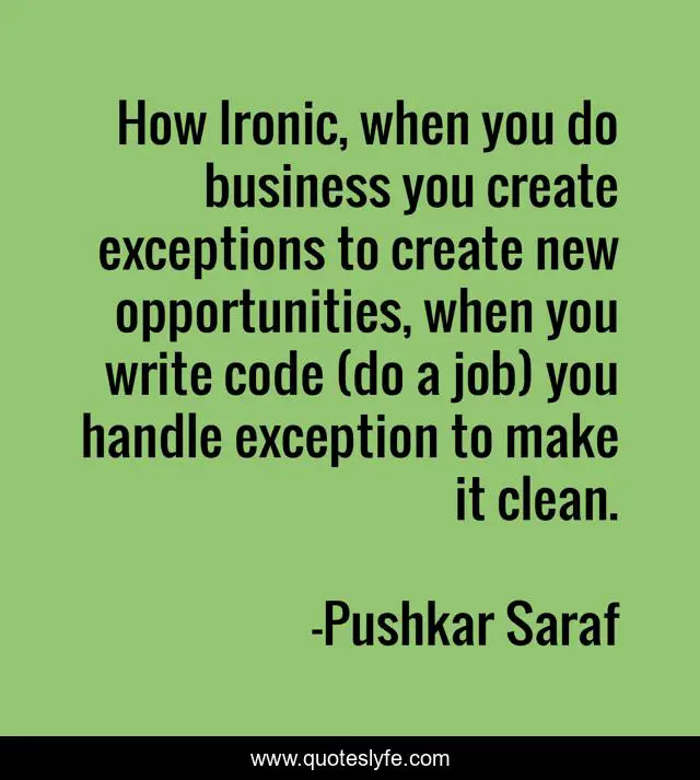 This page presents the quote "How Ironic, when you do business you create exceptions to create new opportunities, when you write code (do a job) you handle exception to make it clean.". Author of this quote is Pushkar Saraf. This quote is about exceptions, opportunity, business, opportunities, software-engineering,.