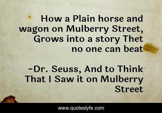 This page presents the quote "How a Plain horse and wagon on Mulberry Street, Grows into a story Thet no one can beat". Author of this quote is Dr. Seuss, And to Think That I Saw it on Mulberry Street. .