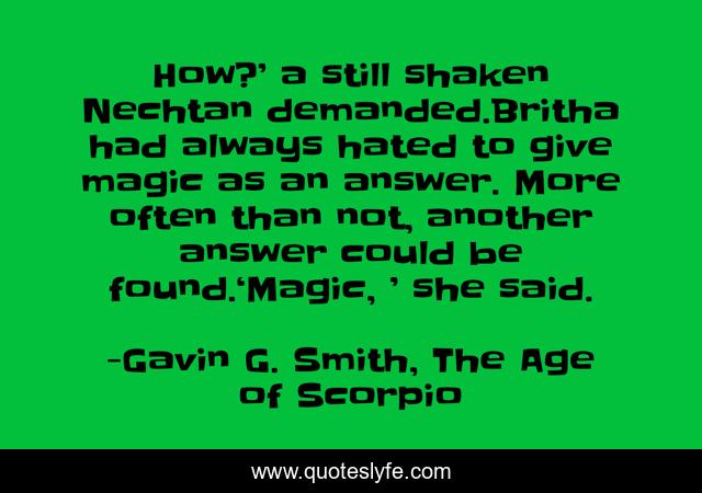 This page presents the quote "How?’ a still shaken Nechtan demanded.Britha had always hated to give magic as an answer. More often than not, another answer could be found.‘Magic, ’ she said.". Author of this quote is Gavin G. Smith, The Age of Scorpio. .