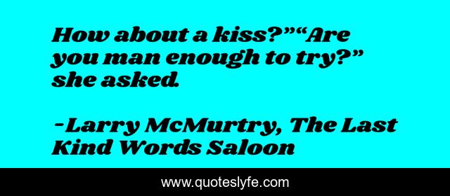 This page presents the quote "How about a kiss?”“Are you man enough to try?” she asked.". Author of this quote is Larry McMurtry, The Last Kind Words Saloon. This quote is about man-enough, kiss,.
