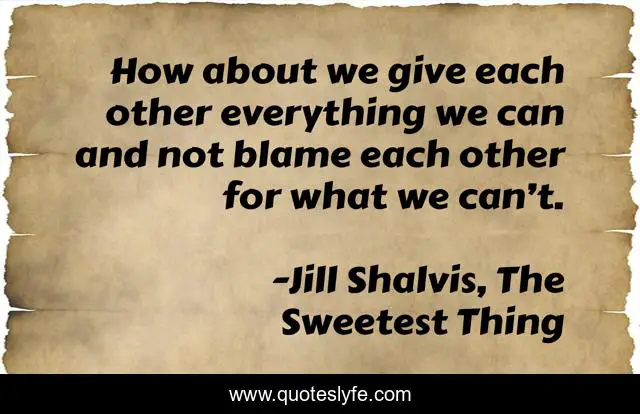 This page presents the quote "How about we give each other everything we can and not blame each other for what we can’t.". Author of this quote is Jill Shalvis, The Sweetest Thing. .