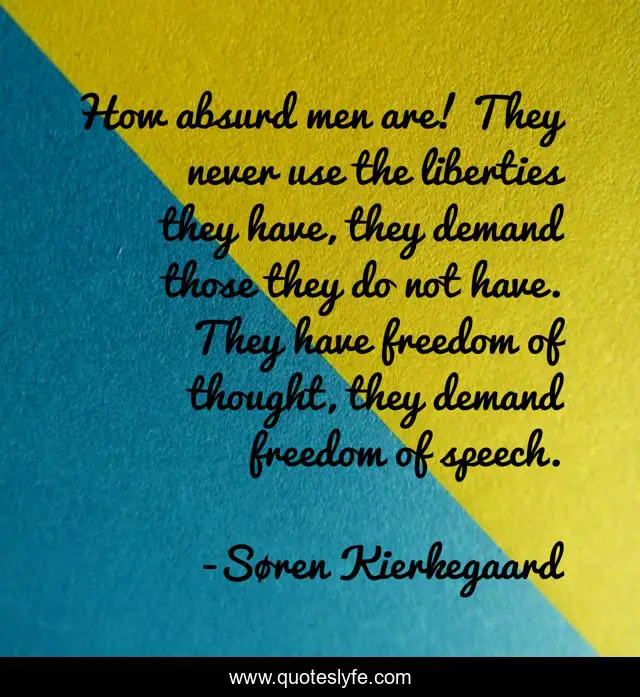 This page presents the quote "How absurd men are! They never use the liberties they have, they demand those they do not have. They have freedom of thought, they demand freedom of speech.". Author of this quote is Søren Kierkegaard. .