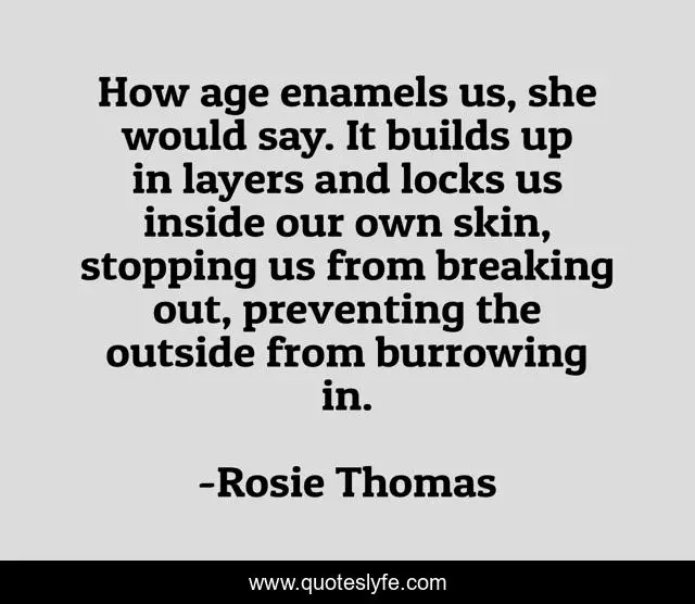 This page presents the quote "How age enamels us, she would say. It builds up in layers and locks us inside our own skin, stopping us from breaking out, preventing the outside from burrowing in.". Author of this quote is Rosie Thomas. This quote is about historical-fiction, fantasy-fiction,.