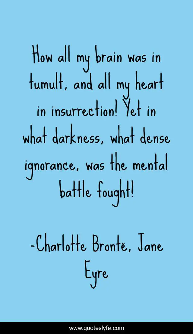 This page presents the quote "How all my brain was in tumult, and all my heart in insurrection! Yet in what darkness, what dense ignorance, was the mental battle fought!". Author of this quote is Charlotte Brontë, Jane Eyre. This quote is about heart, insurrection, tumult, ignorance, jane-eyre, brain,.