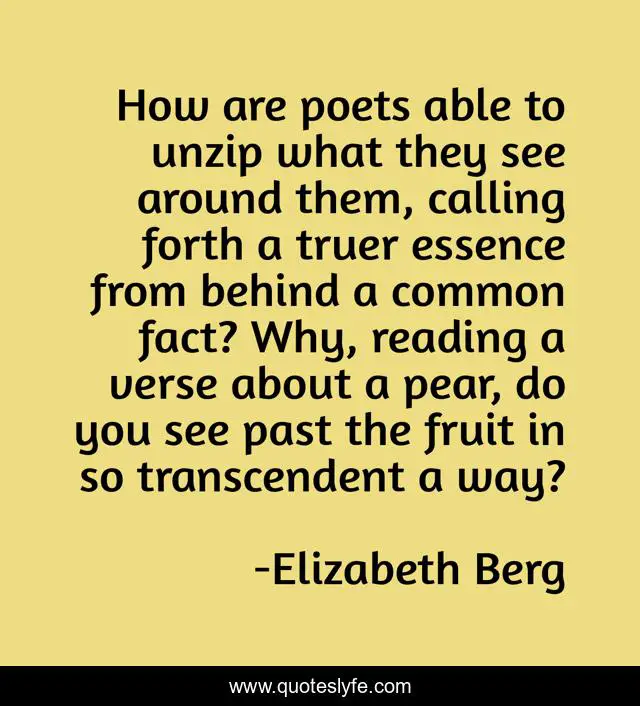 This page presents the quote "How are poets able to unzip what they see around them, calling forth a truer essence from behind a common fact? Why, reading a verse about a pear, do you see past the fruit in so transcendent a way?". Author of this quote is Elizabeth Berg. .