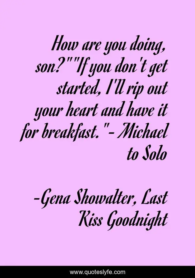 This page presents the quote "How are you doing, son?""If you don't get started, I'll rip out your heart and have it for breakfast."- Michael to Solo". Author of this quote is Gena Showalter, Last Kiss Goodnight. This quote is about funny, crazy, comedy, solo,.