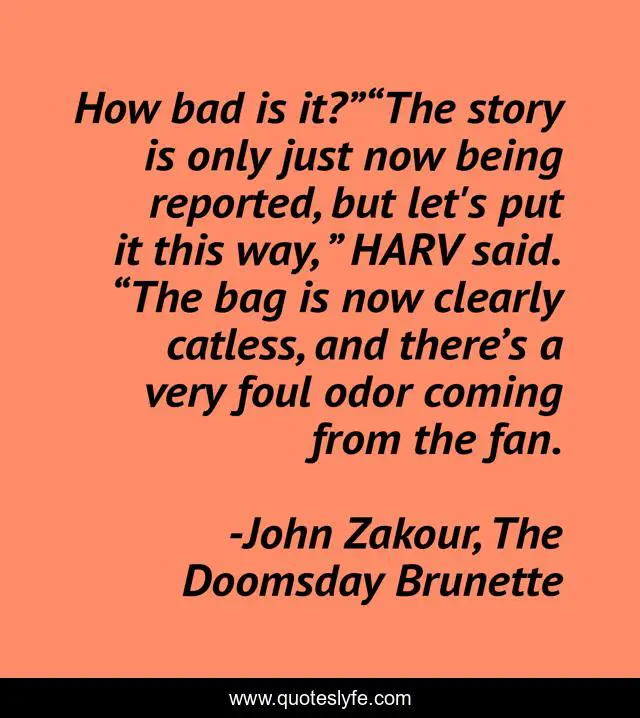 This page presents the quote "How bad is it?”“The story is only just now being reported, but let's put it this way, ” HARV said. “The bag is now clearly catless, and there’s a very foul odor coming from the fan.". Author of this quote is John Zakour, The Doomsday Brunette. This quote is about humor, sci-fi-humour-comedy, sci-fi,.