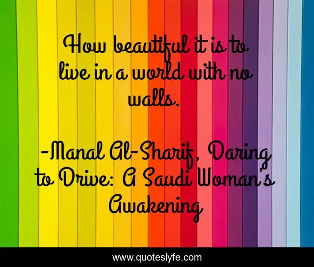 This page presents the quote "How beautiful it is to live in a world with no walls.". Author of this quote is Manal Al-Sharif, Daring to Drive: A Saudi Woman’s Awakening. This quote is about manal-al-sharif, saudi-arabia, equality, driving, world-with-no-walls, saudi-women, women-s-rights, daring-to-drive, patriarchal-society,.
