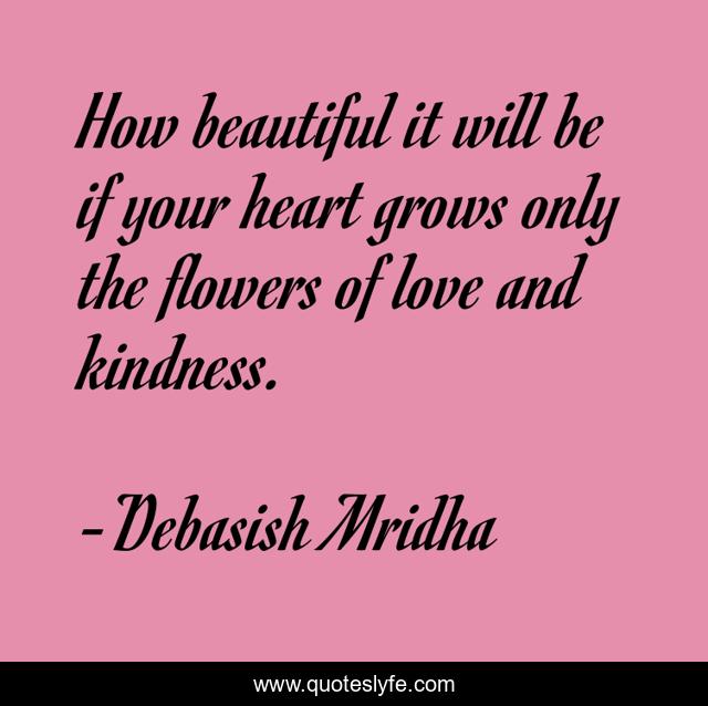 This page presents the quote "How beautiful it will be if your heart grows only the flowers of love and kindness.". Author of this quote is Debasish Mridha. This quote is about beautiful, flowers-of-love-and-kindness, philosophy, debasish-mridha, quotes, how-beautiful-it-will-be, debasish-mridha-md, inspirational, enthusiasm,.