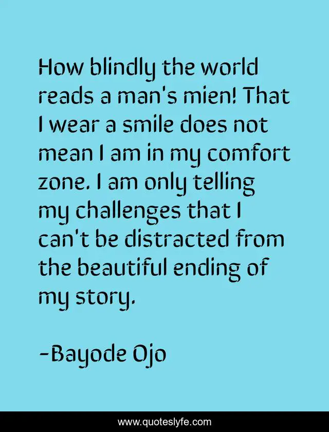 This page presents the quote "How blindly the world reads a man's mien! That I wear a smile does not mean I am in my comfort zone. I am only telling my challenges that I can't be distracted from the beautiful ending of my story.". Author of this quote is Bayode Ojo. This quote is about challenges, determination, hope,.