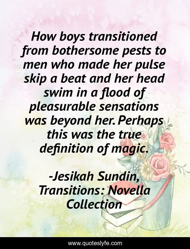 This page presents the quote "How boys transitioned from bothersome pests to men who made her pulse skip a beat and her head swim in a flood of pleasurable sensations was beyond her. Perhaps this was the true definition of magic.". Author of this quote is Jesikah Sundin, Transitions: Novella Collection. This quote is about magic, the-biodome-chronicles, men, rain, romance, boys, jesikah-sundin, transitions,.
