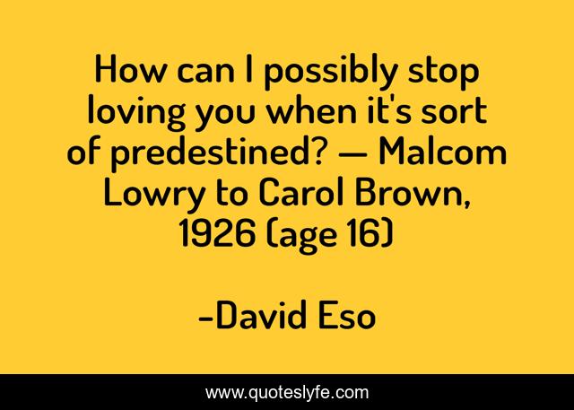 This page presents the quote "How can I possibly stop loving you when it's sort of predestined? — Malcom Lowry to Carol Brown, 1926 (age 16)". Author of this quote is David Eso. This quote is about love, destiny, affection,.