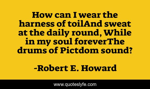 This page presents the quote "How can I wear the harness of toilAnd sweat at the daily round, While in my soul foreverThe drums of Pictdom sound?". Author of this quote is Robert E. Howard. This quote is about poem, inspirational, enthusiasm,.