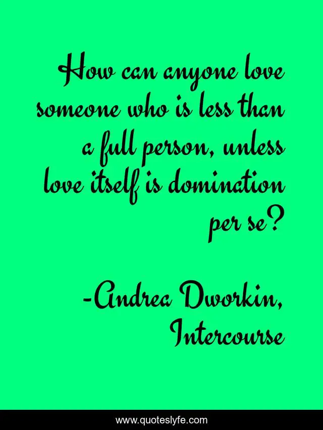 This page presents the quote "How can anyone love someone who is less than a full person, unless love itself is domination per se?". Author of this quote is Andrea Dworkin, Intercourse. This quote is about dignity, domination, love, affection, patriarchy,.