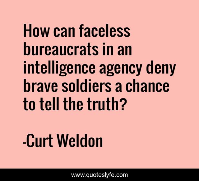 This page presents the quote "How can faceless bureaucrats in an intelligence agency deny brave soldiers a chance to tell the truth?". Author of this quote is Curt Weldon. This quote is about chance, brave, truth,.