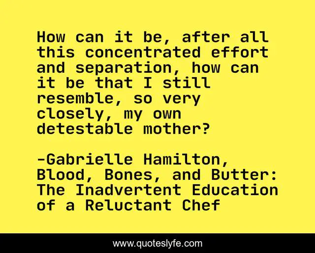 This page presents the quote "How can it be, after all this concentrated effort and separation, how can it be that I still resemble, so very closely, my own detestable mother?". Author of this quote is Gabrielle Hamilton, Blood, Bones, and Butter: The Inadvertent Education of a Reluctant Chef. This quote is about parents-and-children, adulthood, humor, family, parents, growing-up, becoming-your-parents,.