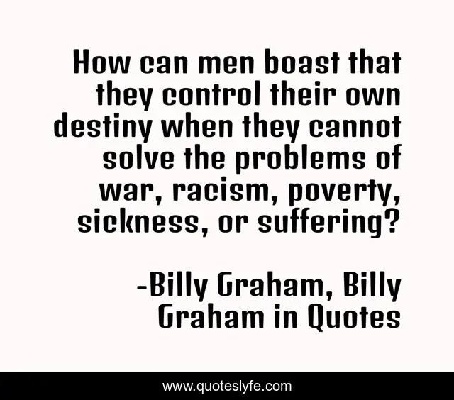 This page presents the quote "How can men boast that they control their own destiny when they cannot solve the problems of war, racism, poverty, sickness, or suffering?". Author of this quote is Billy Graham, Billy Graham in Quotes. This quote is about race, billy-graham,.