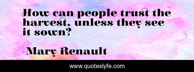 This page presents the quote "How can people trust the harvest, unless they see it sown?". Author of this quote is Mary Renault. This quote is about see, harvest, people,.