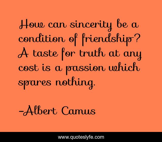 This page presents the quote "How can sincerity be a condition of friendship? A taste for truth at any cost is a passion which spares nothing.". Author of this quote is Albert Camus. This quote is about friendship, passion,.