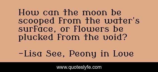 This page presents the quote "How can the moon be scooped from the water's surface, or flowers be plucked from the void?". Author of this quote is Lisa See, Peony in Love. This quote is about memory, death, romantic, dreams, moon,.