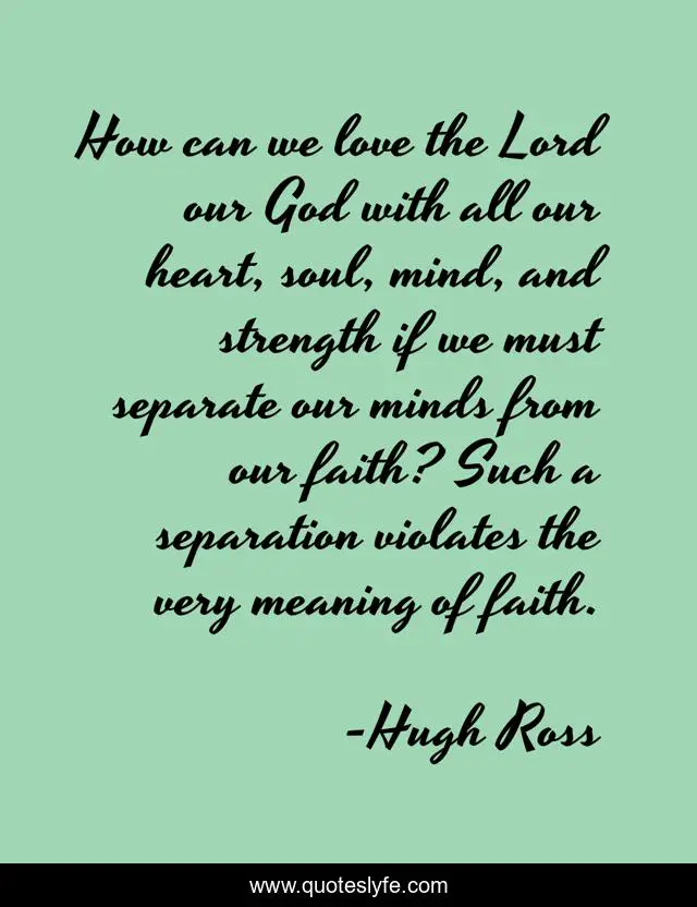 This page presents the quote "How can we love the Lord our God with all our heart, soul, mind, and strength if we must separate our minds from our faith? Such a separation violates the very meaning of faith.". Author of this quote is Hugh Ross. This quote is about faith, love, affection, god,.