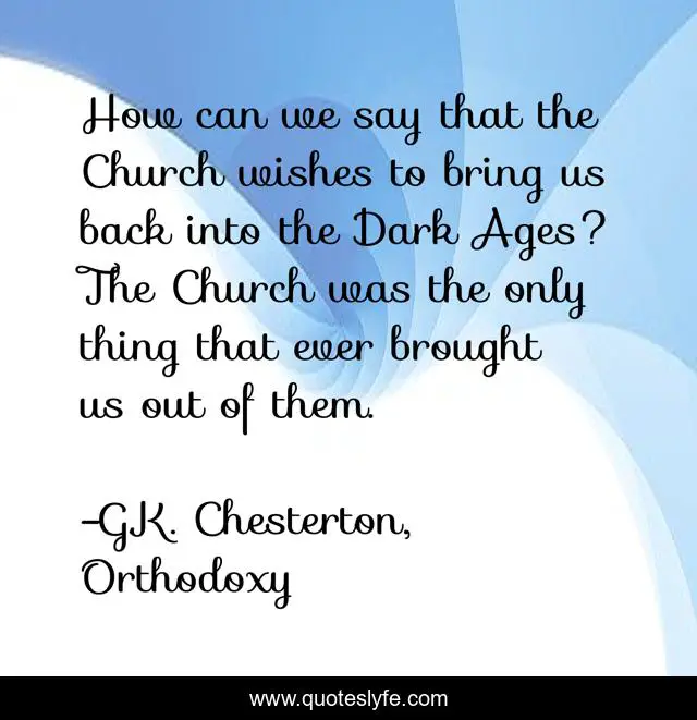 This page presents the quote "How can we say that the Church wishes to bring us back into the Dark Ages? The Church was the only thing that ever brought us out of them.". Author of this quote is G.K. Chesterton, Orthodoxy. This quote is about dark-ages, ignorance, church,.