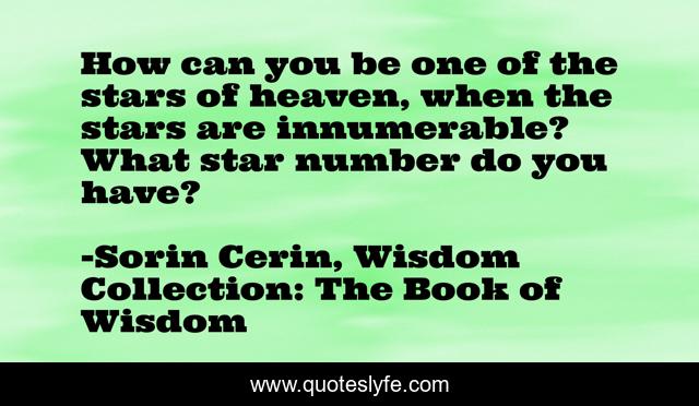 This page presents the quote "How can you be one of the stars of heaven, when the stars are innumerable? What star number do you have?". Author of this quote is Sorin Cerin, Wisdom Collection: The Book of Wisdom. This quote is about stars, wisdom,.