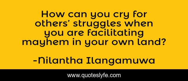 This page presents the quote "How can you cry for others’ struggles when you are facilitating mayhem in your own land?". Author of this quote is Nilantha Ilangamuwa. This quote is about politics, diplomacy, international-relations,.