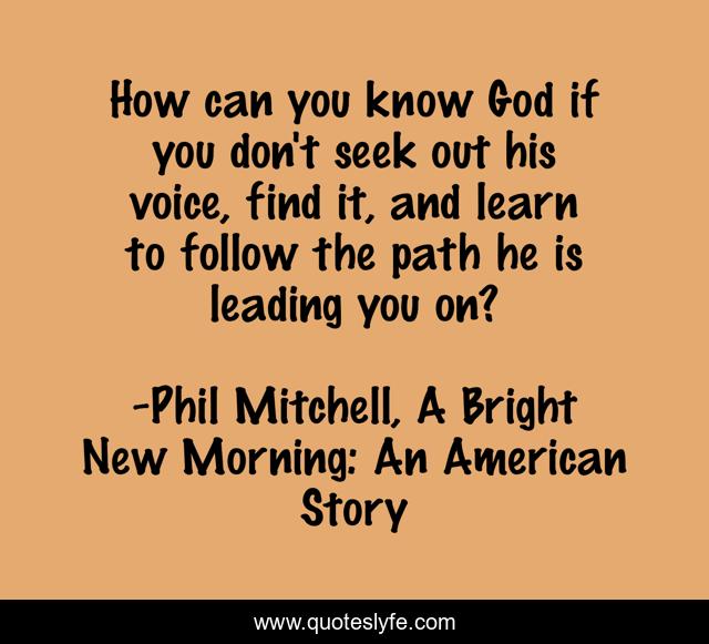 This page presents the quote "How can you know God if you don't seek out his voice, find it, and learn to follow the path he is leading you on?". Author of this quote is Phil Mitchell, A Bright New Morning: An American Story. This quote is about faith, faith-strength,.