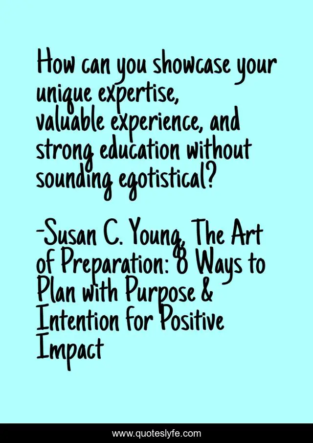 "Susan C. Young, The Art of Preparation: 8 Ways to Plan with Purpose & Intention for Positive Impact Quotes." Quoteslyfe.com, 2025. Sun. 14 Dec. 2025. <https://www.quoteslyfe.com/quote/How-can-you-showcase-your-unique-expertise-227427>.