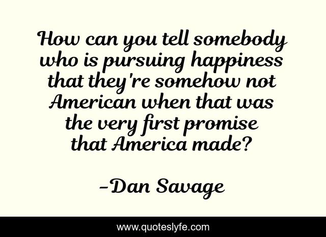 This page presents the quote "How can you tell somebody who is pursuing happiness that they're somehow not American when that was the very first promise that America made?". Author of this quote is Dan Savage. This quote is about americanism, happiness,.
