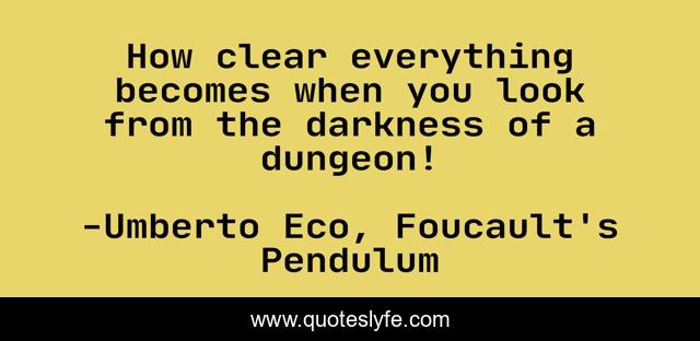 This page presents the quote "How clear everything becomes when you look from the darkness of a dungeon!". Author of this quote is Umberto Eco, Foucault's Pendulum. This quote is about dungeon, darkness, clearness,.