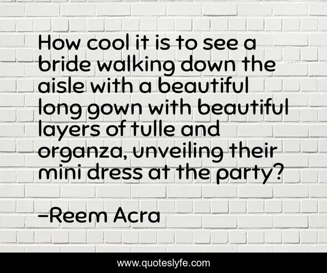 This page presents the quote "How cool it is to see a bride walking down the aisle with a beautiful long gown with beautiful layers of tulle and organza, unveiling their mini dress at the party?". Author of this quote is Reem Acra. This quote is about beautiful, walking, dress,.