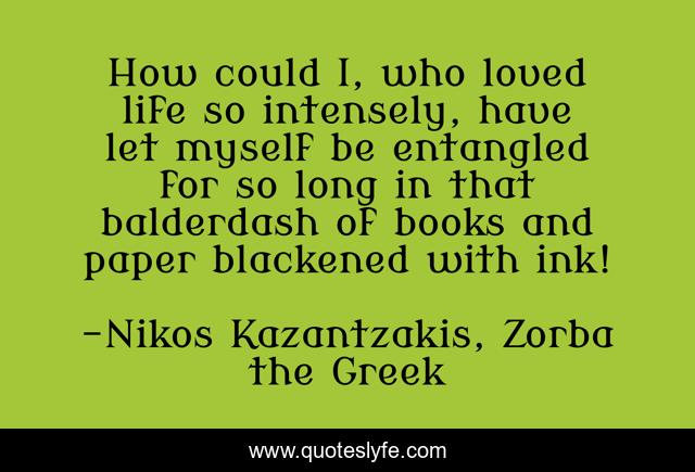 This page presents the quote "How could I, who loved life so intensely, have let myself be entangled for so long in that balderdash of books and paper blackened with ink!". Author of this quote is Nikos Kazantzakis, Zorba the Greek. .