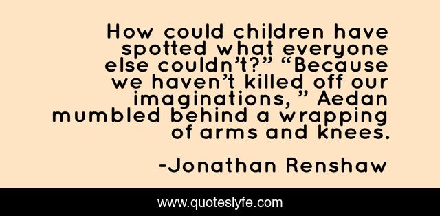 This page presents the quote "How could children have spotted what everyone else couldn’t?” “Because we haven’t killed off our imaginations, ” Aedan mumbled behind a wrapping of arms and knees.". Author of this quote is Jonathan Renshaw. .
