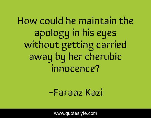 This page presents the quote "How could he maintain the apology in his eyes without getting carried away by her cherubic innocence?". Author of this quote is Faraaz Kazi. This quote is about love, apology, affection, innocence,.