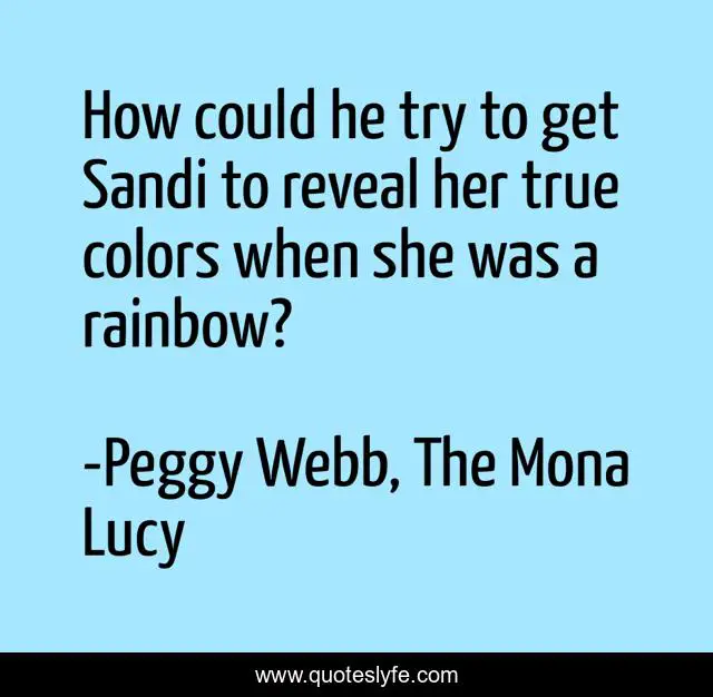 This page presents the quote "How could he try to get Sandi to reveal her true colors when she was a rainbow?". Author of this quote is Peggy Webb, The Mona Lucy. This quote is about rainbow, colors, personality,.