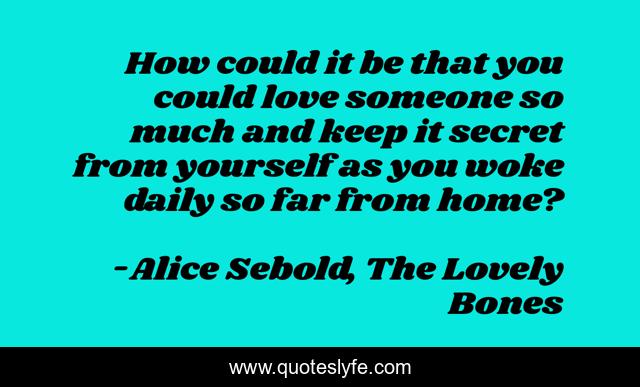 This page presents the quote "How could it be that you could love someone so much and keep it secret from yourself as you woke daily so far from home?". Author of this quote is Alice Sebold, The Lovely Bones. This quote is about secret, love, affection,.