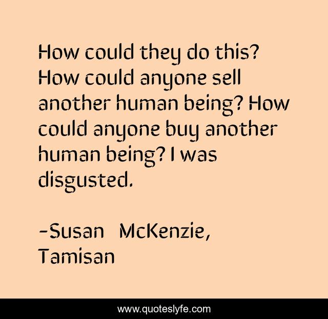This page presents the quote "How could they do this? How could anyone sell another human being? How could anyone buy another human being? I was disgusted.". Author of this quote is Susan McKenzie, Tamisan. This quote is about paranormal-romance, sci-fi-romance,.