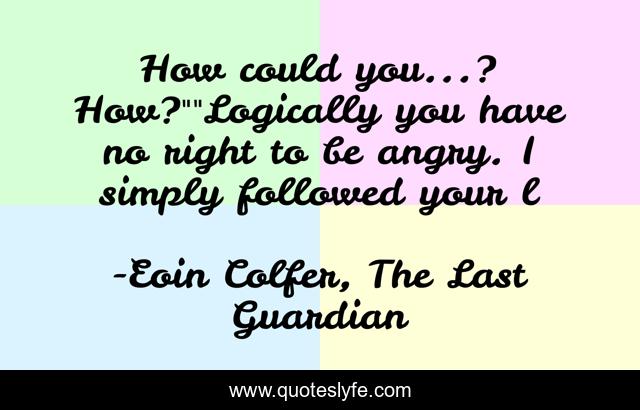 This page presents the quote "How could you...? How?""Logically you have no right to be angry. I simply followed your l". Author of this quote is Eoin Colfer, The Last Guardian. This quote is about holly, sacrifice, artemis,.