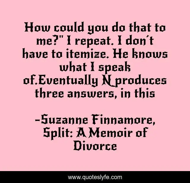 This page presents the quote "How could you do that to me?" I repeat. I don´t have to itemize. He knows what I speak of.Eventually N produces three answers, in this". Author of this quote is Suzanne Finnamore, Split: A Memoir of Divorce. This quote is about relationships, infidelity, cheating, deception, divorce, breaking-up, marriage,.