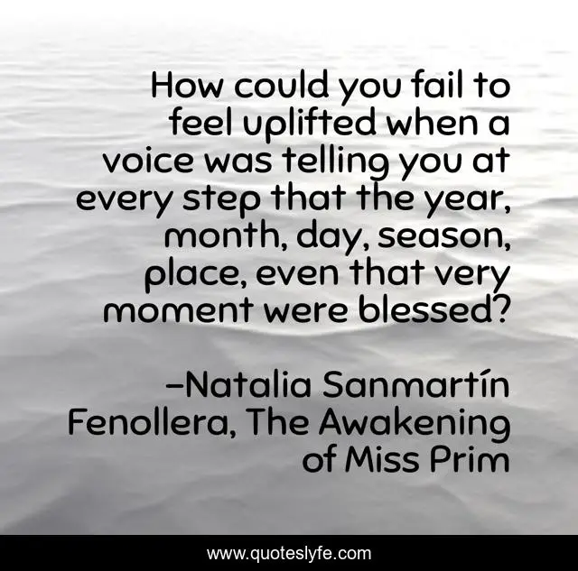This page presents the quote "How could you fail to feel uplifted when a voice was telling you at every step that the year, month, day, season, place, even that very moment were blessed?". Author of this quote is Natalia Sanmartín Fenollera, The Awakening of Miss Prim. This quote is about gratitude, blessings,.
