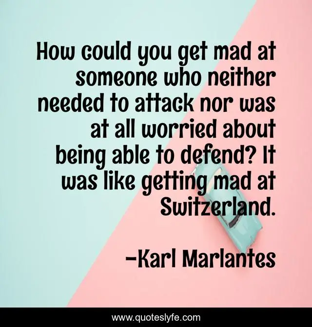 This page presents the quote "How could you get mad at someone who neither needed to attack nor was at all worried about being able to defend? It was like getting mad at Switzerland.". Author of this quote is Karl Marlantes. This quote is about madness, defend, karl-marlantes, attack, mad, switzerland, war,.