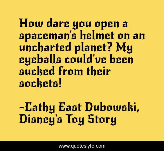 This page presents the quote "How dare you open a spaceman's helmet on an uncharted planet? My eyeballs could've been sucked from their sockets!". Author of this quote is Cathy East Dubowski, Disney's Toy Story. This quote is about danger, funny, comedy, space, eyeballs,.