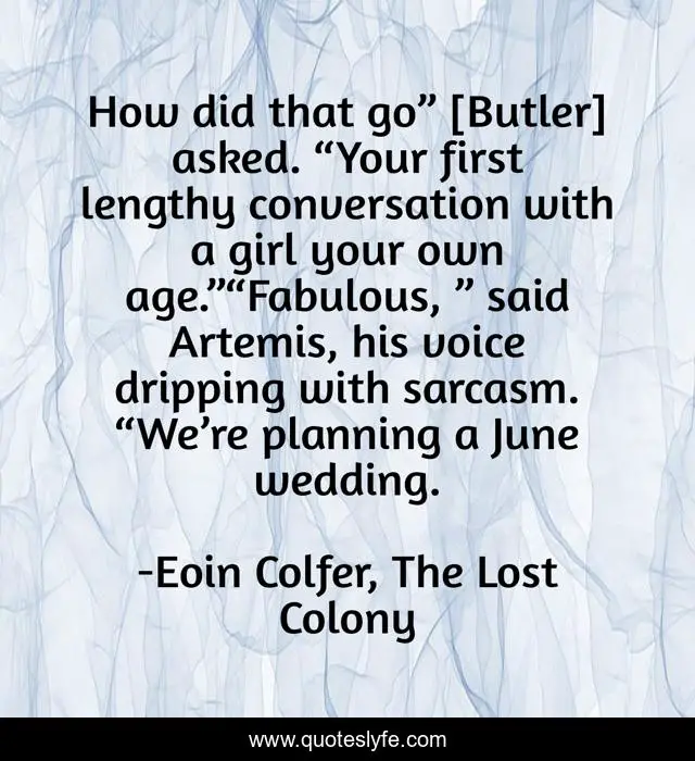 This page presents the quote "How did that go” [Butler] asked. “Your first lengthy conversation with a girl your own age.”“Fabulous, ” said Artemis, his voice dripping with sarcasm. “We’re planning a June wedding.". Author of this quote is Eoin Colfer, The Lost Colony. This quote is about conversations, love, girls, affection,.