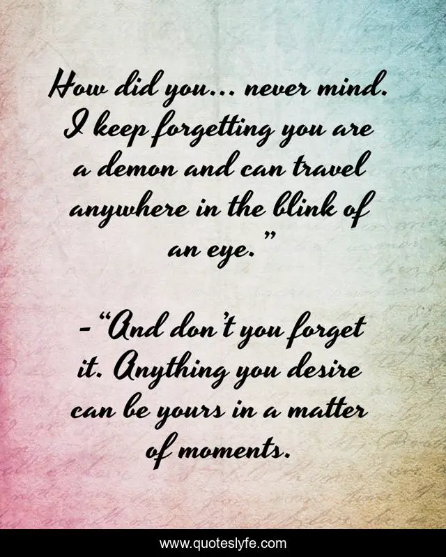 This page presents the quote "How did you… never mind. I keep forgetting you are a demon and can travel anywhere in the blink of an eye.”". Author of this quote is “And don’t you forget it. Anything you desire can be yours in a matter of moments.. This quote is about brynn myers, redemption,.