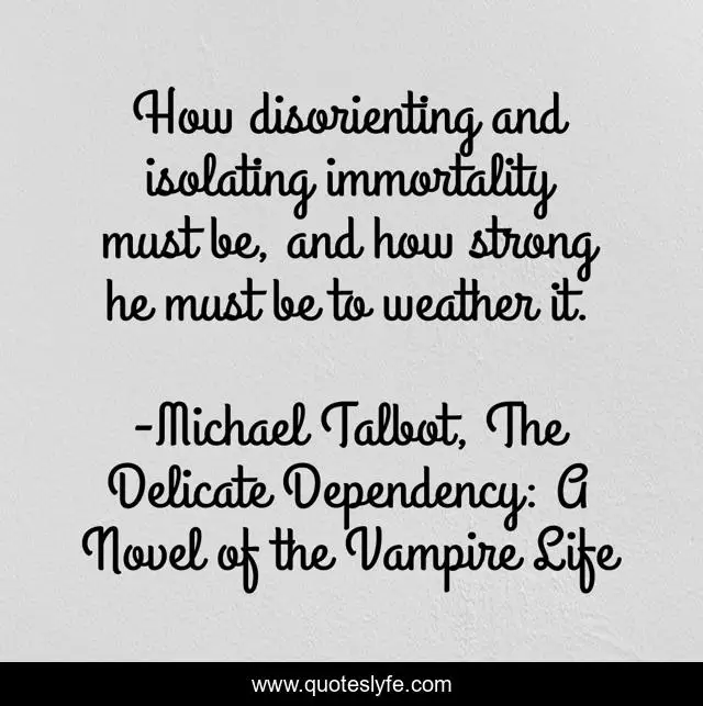 "Michael Talbot, The Delicate Dependency: A Novel of the Vampire Life Quotes." Quoteslyfe.com, 2025. Sat. 13 Dec. 2025. <https://www.quoteslyfe.com/quote/How-disorienting-and-isolating-immortality-must-be-202643>.