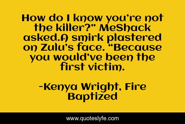 This page presents the quote "How do I know you’re not the killer?” MeShack asked.A smirk plastered on Zulu’s face. “Because you would’ve been the first victim.". Author of this quote is Kenya Wright, Fire Baptized. This quote is about murder, urban-fantasy-romance, vampires, fairies, demons, witches,.