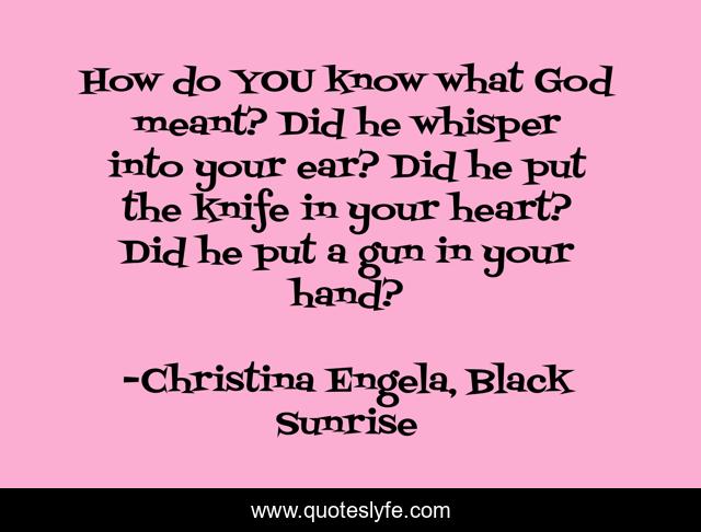 This page presents the quote "How do YOU know what God meant? Did he whisper into your ear? Did he put the knife in your heart? Did he put a gun in your hand?". Author of this quote is Christina Engela, Black Sunrise. This quote is about heart, whisper, hand, god, ear, knife,.